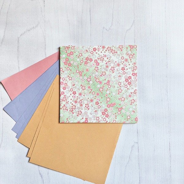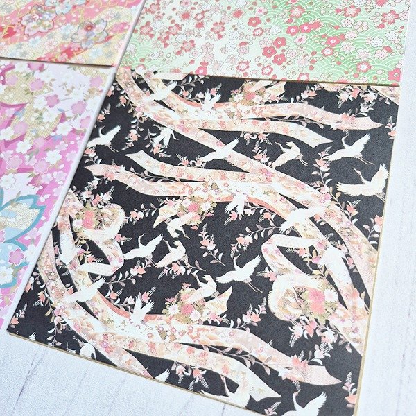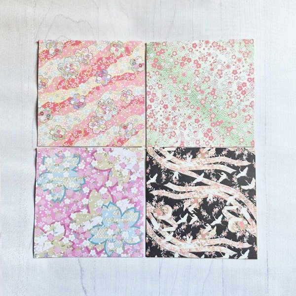 Este set incluye 36 papeles de origami: 4 motivos diferentes de patrones japoneses tradicionales inspirados en la naturaleza, 9 de cada uno.